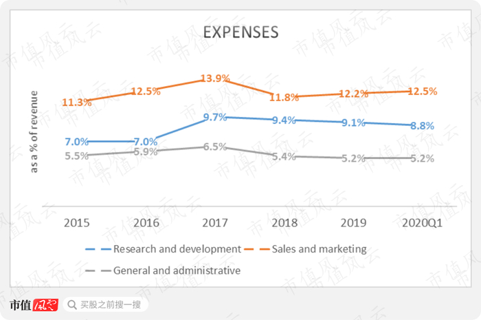 2015-2017年,得益于用户和收入的大增,公司生产成本占同期收入的比重下降明显,拉动毛利率提升。