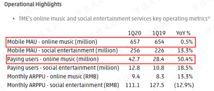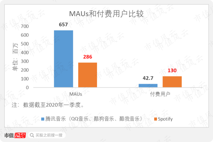截至2020年一季度末,腾讯音乐的在线音乐(注:包括QQ音乐、酷狗音乐和酷我音乐)MAUs为6.57亿,其中付费用户4270万。