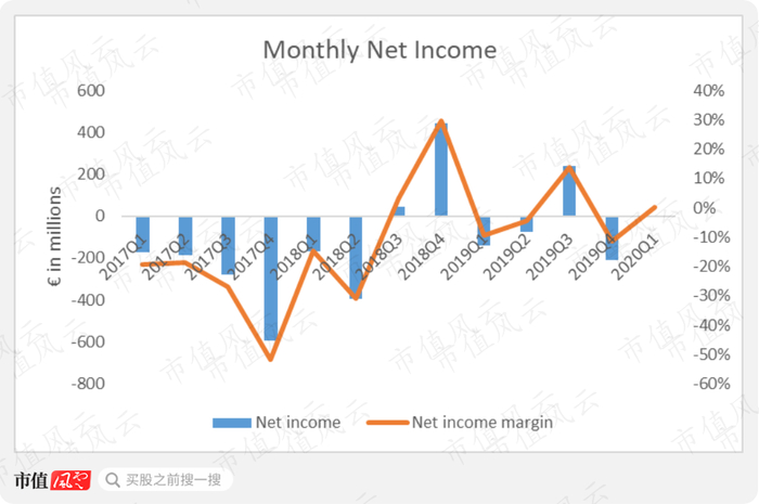 2019年,公司净亏损1.86亿欧元,较去年同期7800万欧元的净亏损规模有所扩大,但仍明显好于过往年份。
