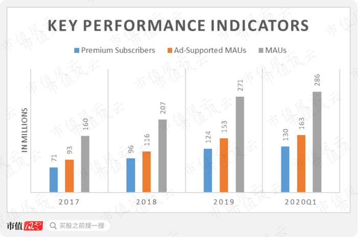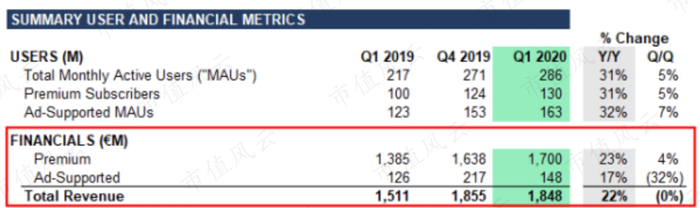 在过往报告期内,Spotify的广告支持用户数均高于同期的付费用户数。截至2020年一季度末,广告支持用户和付费用户分别为1.63亿和1.3亿。
