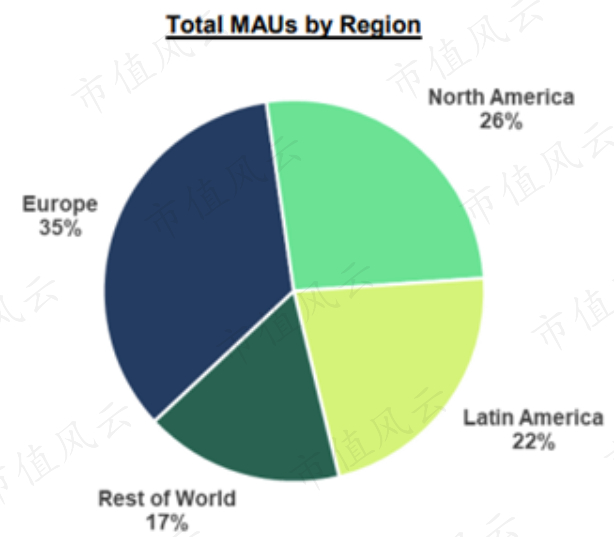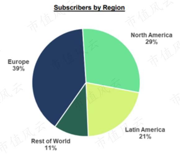 付费用户(Subscribers)的分布与MAUs的分布基本一致:欧洲是最大的付费用户市场,占39%的付费用户;北美是第二大市场,占29%的付费用户。