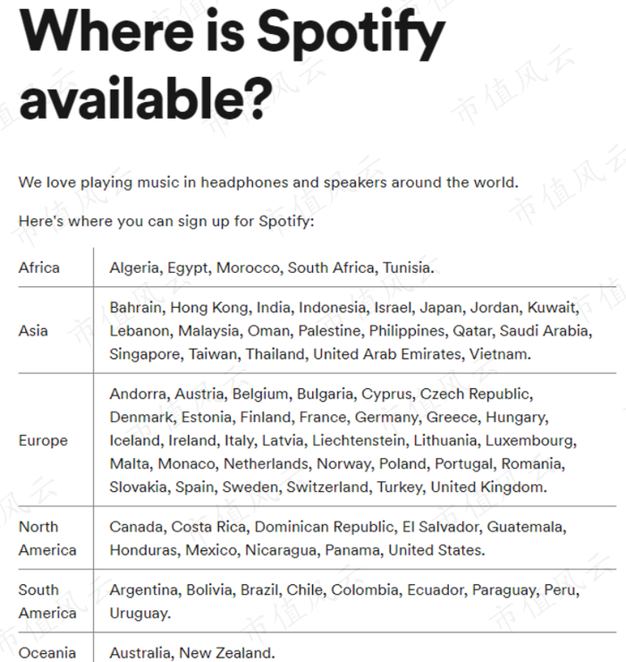 从MAUs分布来看,欧洲是Spotify最大的市场,35%的MAUs分布在此;北美是第二大市场,占26%的MAUs。