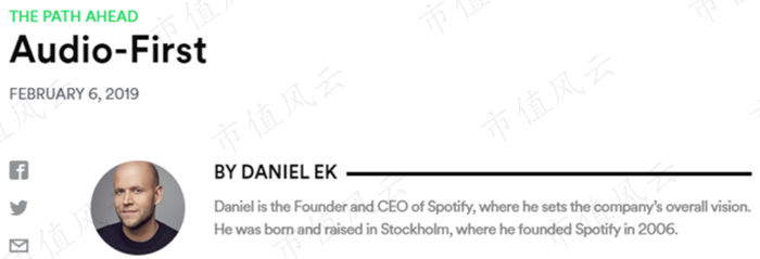 Spotify的目标是同时成为全球最大音乐平台和播客平台,公司CEO Daniel Ek称之为“音频优先(Audio-First)”策略。