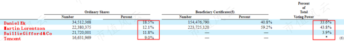 公司的两名创始人Daniel Ek和Martin Lorentzon合计持有公司高达77.4%的投票权,能够掌控公司决策权。