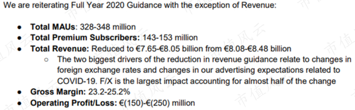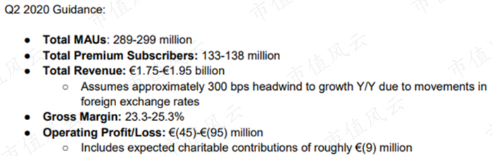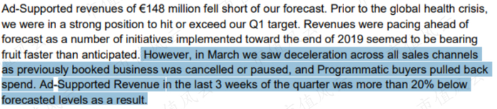 2020年一季度广告支持收入环比大跌,是导致公司同期总收入(18.4亿欧元)不及2019年四季度(18.5亿欧元)的主要原因。
