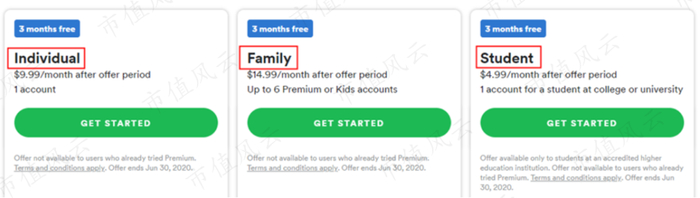 Spotify目前提供个人(Individual)、家庭(Family)和学生(Student)三种不同收费的套餐。