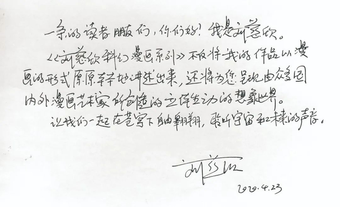 刘慈欣给一条读者的亲笔信