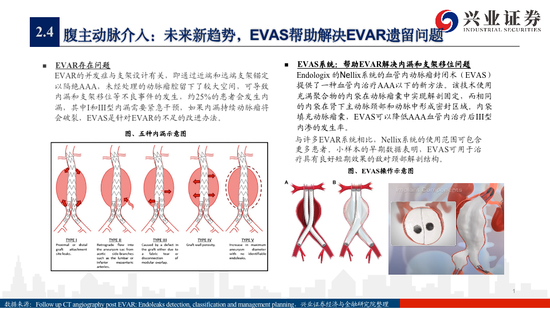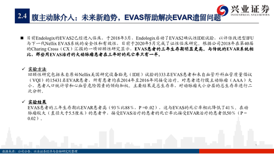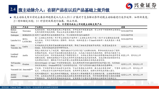 腹主动脉产品:腹主动脉支架目前的主要在研趋势是从几点入手1)扩展对于复杂解剖条件的腹主动脉瘤进行逐步延伸,如颈部角度;2)增加锚定性能;3)对密封效果进行拓展,防止内漏。但是目前不同于传统的技术路径,一个未来新技术趋势也在慢慢发展,EVAS技术相比于传统的覆膜支架更好的提高了稳定性和防内漏性。