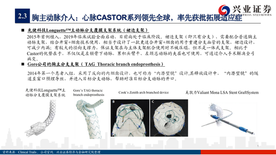 胸主动脉产品:目前市场产品以传统直管型覆膜支架为主,各自产品特点各有差异,有的产品通过性比较好有的产品支撑力比较强,但未来的整体趋势是通过对于产品设计的升级,逐步将适应症拓展到主动脉弓部的病变,从而拓展TEVAR的适应症,目前看来,主动脉支架主要的技术路线分为一体式和分体式,分体式整体研发难度比较低一些操作也相对便捷灵活,但会面临内漏问题,对此先健科技的在研产品针对I型内漏给出了一个比较好的解决方案。其中心脉医疗已经率先在2017年上市Castor系列覆膜支架,成功将适应症扩展到部分左锁骨下静脉的A型夹层,技术属于全球领先。