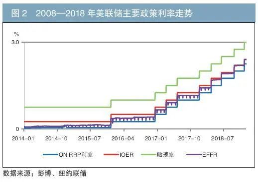 贴现率、IOER、RP和ON RRP是当前美联储控制EFFR的主要工具。前面提到,理论上IOER应该是EFFR的下限,但美联储不向GSE的存款支付利息,GSE却是最主要的资金提供者,这导致许多外国银行美国分支机构从GSE融入资金后再转手存入美联储进行套利[2]。因此,EFFR长期低于IOER,IOER反而成了利率走廊上限。于是美联储开始使用ON RRP解决这个问题,防范利率下行失控。美联储通过ON RRP操作融入美元,无风险、有质押且受众广泛,GSE不会以低于ON RRP利率的水平出借资金,ON RRP利率成为实质的利率走廊下限。2008—2018年,EFFR一直介于ON RRP利率和IOER之间(见图2);随着美联储加息和缩表,从2018年底开始,EFFR不断突破IOER(见图3),表明真实的存款准备金拆借需求已经出现。