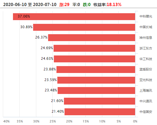 在成分股区间涨跌排行榜中,中科曙光(603019)以最近一个月37.06%的涨幅高居榜首,另外,中国长城近一个月涨幅亦在30%以上。