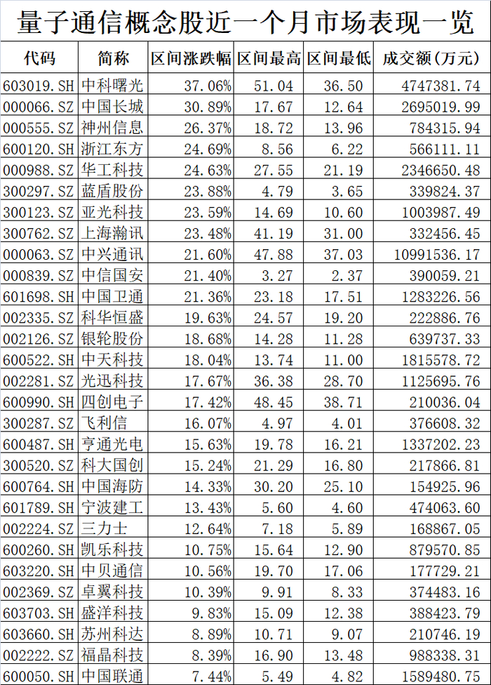 除此之外,月涨幅达24.63%的华工科技(000988)曾表示量子通信为公司战略发展的储备项目;光迅科技(002281)与国盾量子联合成立了山东国迅量子芯科技有限公司,从事量子通信设备光电集成芯片的研发,月涨幅为17.67%。