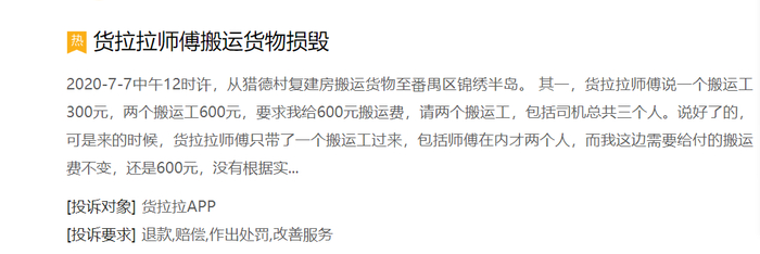 2020年5月份,媒体曝光货拉拉司机索要天价费用事件,不足两公里要价5400元(实际支付3440元),而货拉拉平台客服接受媒体采访时称“当事人炒作”。