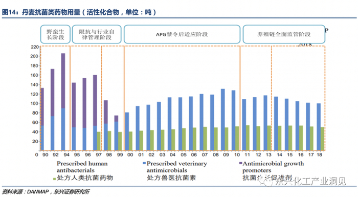限抗与行业自律管理阶段:丹麦自1995年开始,陆续开始禁止抗生素类的饲料添加剂;1998年,各养殖行业宣布自愿停止在肉牛、肉鸡及35公斤以上的生猪养殖中使用抗生素饲料添加剂,仍然使用AGP的农户将被征收2美元/头的税费。丹麦的抗生素饲料添加剂用量在1995年和1998年出现了阶梯式下降,也是源于国家限抗政策和养殖行业的自律管理。