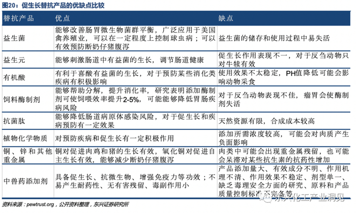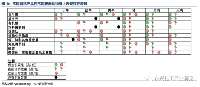 解决养殖效率下降的问题需要养殖链各环节的综合配合,共同提升管理水平,积极探索替代解决方案。具备促生长功能和疾病预防功能的抗生素替代产品有望打开市场空间。目前国际上用于预防疾病的替抗产品有疫苗、免疫调节剂以及其他农场综合管理和生物安全方案等;用于促生长的替抗产品主要有饲料酶制剂、益生菌、益生元、抗菌肽、有机酸、植物化学物质等。而各类替代产品使用的时间、作用的机理,以及在不同动物饲喂过程中表现出的最终效果都存在很大的差异。