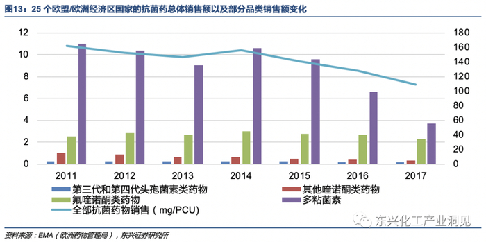 每年向欧盟食品药品管理局报告抗菌药物销售数量的25个国家在2011年到2017年,抗菌药物总体销售量(mg/PCU)下降了32.5%,其中最畅销的四环素类药物销售下降了46%,第三代及第四代头孢菌素的销售额下跌20.9%,多粘菌素的销售额下跌66.4%。
