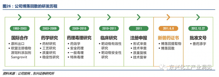 公司于2018年收购世唯科技,其主打产品博落回提取物(兽药原料药)和博落回散(兽药制剂)、博普总碱(兽药原料药)和博普总碱散(兽药制剂)均取得国家新兽药证书。其中,博落回散还取得了农业部颁发的药物饲料添加剂证书,是我国第一个自主研发可长期添加使用的天然植物药源药物饲料添加剂专利产品,填补了国内天然植物药源药物饲料添加剂的空白。公司在2018年收购世唯科技以后,就已经开始着手提升植物提取物博落回散的产能,从博落回植物原材料储备到提取生产设备均做了准备。