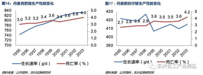 抗生素促生长剂(AGP)的全面禁用对生猪生长性能会造成一定不利的影响。以丹麦为例,丹麦的猪生产委员会对禁用抗生素促生长剂前后的育肥猪和断奶仔猪的生产性能进行了监控。对于育肥猪来说,2000年之后育肥猪死亡率略有上涨,生长速率的增速在AGP禁令后有所放缓,由年20g/d的增量降低到10g/d左右。AGP禁用对断奶仔猪影响更大,在1998年行业自愿减少抗生素促生长剂使用之后,断奶仔猪的生长速率大幅下降,死亡率出现了明显提升。因此如何解决禁抗后的动物健康和养殖端的效率问题就成了不容忽视的问题。