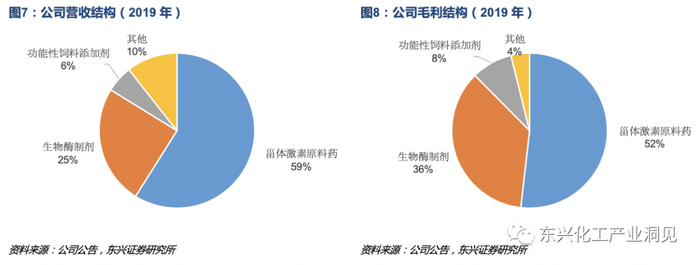 公司主要收入来自甾体激素原料药和生物酶制剂的销售。甾体激素原料药产品营业收入占公司总营业收入的59%,销售毛利润占公司总销售毛利润的52%;生物酶制剂产品营业收入占公司总营业收入的25%,销售毛利润占公司总销售毛利润的36%。