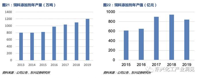 据全国畜牧总站、中国饲料工业协会统计数据显示,2019年我国饲料添加剂产量约为1199.2万吨,较2018年增长8.2%。2019年我国饲料添加剂产品产值839.3亿元,营业收入763.4亿元。其中氨基酸、维生素和矿物元素产量分别为330万吨、127万吨、590万吨,同比分别增长10.5%、14.7%、4.1%。酶制剂和微生物制剂产量继续快速增长,同比增幅分别为16.6%、19.3%。随着饲料禁抗政策的落地和养殖产业链减抗措施的持续收紧,替抗产品总体需求和市场空间将逐步打开。