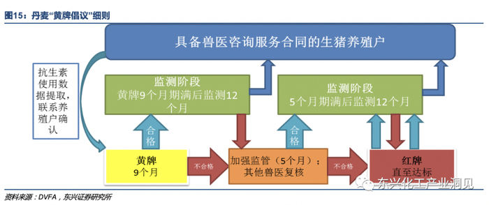 养殖链全面监管阶段:为应对养殖端处方抗菌素持续增长的情况,避免抗生素耐药性增加带来的风险,丹麦兽医和食品管理局于2010年发起了“黄牌倡议”。具体来说,管理部门为猪群和牛群制定了使用抗生素的使用阈值(每天每100只动物的使用剂量),一旦摄入量超过阈值,养殖户会收到黄牌警告,并且承担后续一系列费用。此后在2016年,“黄牌倡议”进一步升级为“差别黄牌”或者说是“加权黄牌”制度,根据抗生素对人类的影响赋予不同权重,进一步规范使用。养殖量的全面严格监管效果显著,自2009年,在动物中使用抗菌素数量开始呈现下降趋势,2018年抗菌素的使用相比2009年下降了23%。