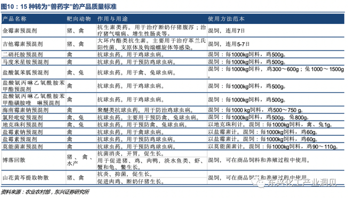 在我国现有的养殖结构下,短期内饲料禁抗将导致治疗用抗生素的用量增加,养殖业抗生素使用总量或不会出现明显下降,并且养殖端可能会存在在饲喂过程中自行添加抗生素的行为。而就长期趋势而言,养殖链减抗是大势所趋,未来政策监管将进一步延伸至养殖环节和兽医处方开具环节,随着政策逐步趋严,养殖业抗生素用量将逐步下滑。