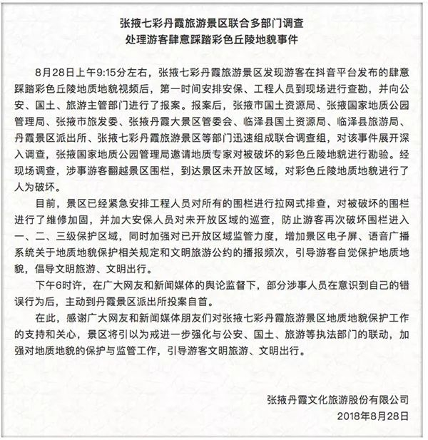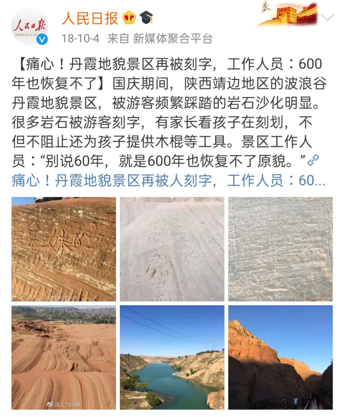 众所周知,丹霞地貌属于不可再生资源,它的形成需要上亿年的时间,且极为脆弱,游客的脚印可能需要60年或者更久才能恢复。此前,也多次出现过游客不听劝说,破坏丹霞地貌景区的事情。