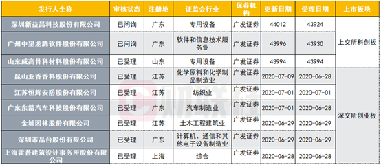 记者梳理后发现,共有3家上交所科创板申报企业,6家深交所创业板申报企业,9家上交所主板申报企业,以及5家深交所中小板申报企业为广发证券保荐。