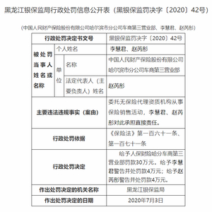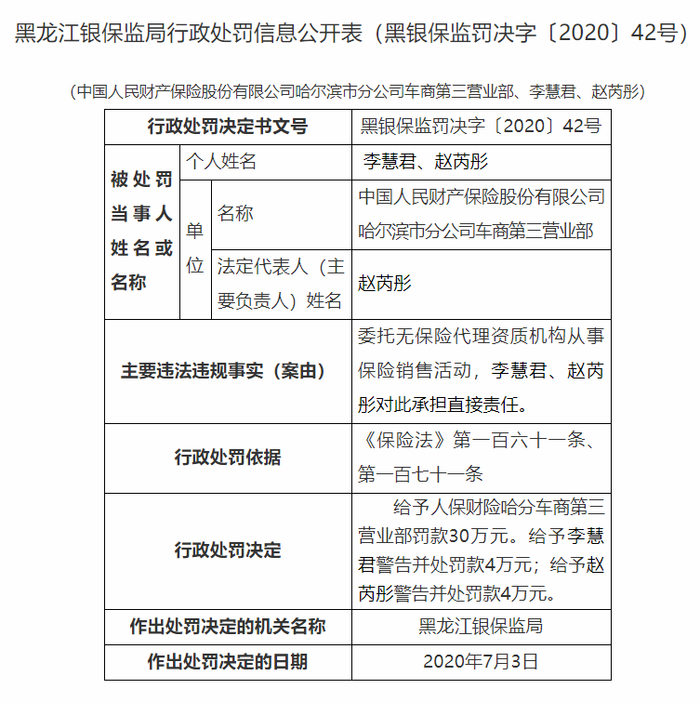 根据行政处罚信息公开表,中国人民财产保险股份有限公司哈尔滨市分公司车商第三营业部(简称“人保财险哈分车商第三营业部”),因委托无保险代理资质机构从事保险销售活动,其工作人员李慧君、赵芮彤对此承担直接责任。