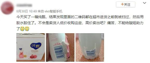 无独有偶,《消费者报道》通过关键词在社交平台检索发现,不少消费者也遇到相同的情况,本打算一箱箱的购买蒙牛纯甄小蛮腰为小姐姐扫码撑腰,购买时箱子外包装没有任何破损,打开却发现所有瓶标的二维码被剪开使用。