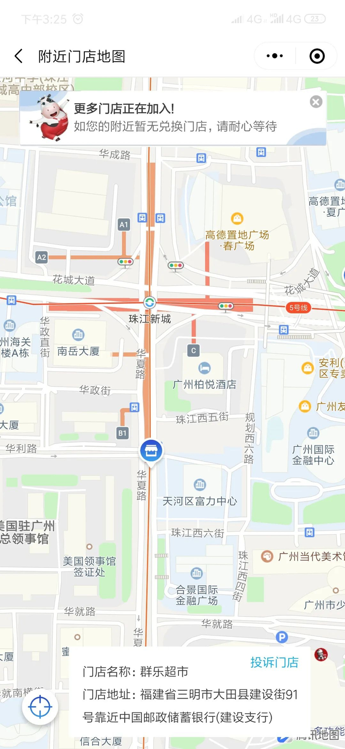 对此,《消费者报道》在某大型超市随机购买了3瓶蒙牛纯甄小蛮腰,其中一瓶获得“再来一瓶”的奖励。记者通过小程序查找官方指定的兑换门店,发现部分指定门店的名称和地址与实际大相径庭,定位为广州市珠江新城的周边,其门店地址却显示为福建省三明市某地。此外,记者根据地图显示的位置到实地探寻,发现该指定门店并不存在。《消费者报道》针对此事多次拨打蒙牛纯甄的客服咨询,但均以忙音结束。