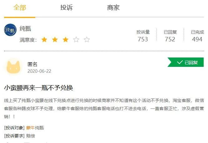 《消费者报道》了解到,“再来一瓶”的奖励需在蒙牛纯甄官方指定的门店进行兑换,但有不少消费者反映蒙牛纯甄所指定的门店实际不存在、商家不愿意兑换等问题。本刊通过黑猫投诉平台检索发现,蒙牛纯甄的相关投诉达753宗,主要投诉为“再来一瓶”的奖励无法兑换。