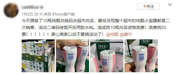 近日,《消费者报道》了解到,不少网友在购买蒙牛纯甄小蛮腰后发现其存在瓶标背面的二维码破损、已被使用等问题,甚至有网友表示通过扫描二维码获得“再来一瓶”的奖励到线下指定门店兑换时却发现无法兑换,认为兑换活动形同虚设,欺骗消费者。