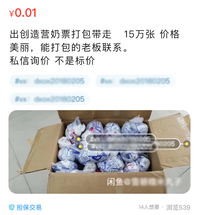 对此,本刊通过闲鱼二手平台检索发现,平台上除了低价售卖大量被割开二维码的蒙牛纯甄小蛮腰外,还有个别用户贩卖大量的二维码,其内容宣称纯甄二维码(又称“奶票”)的数量高达几十万张,面向消费群体主要为后援会、经纪公司及粉丝团体。