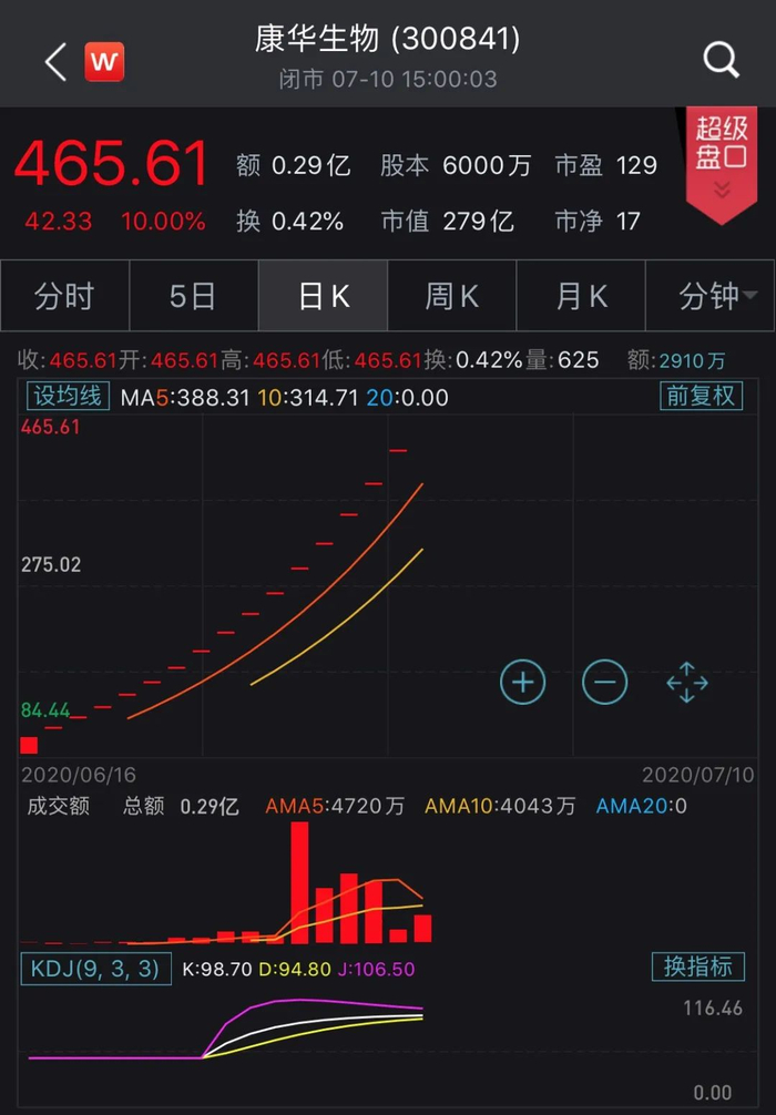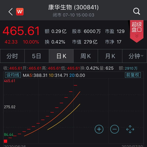 截至7月10日收盘,康华生物股价已高达465.61元/股,成为当之无愧的“川股王”,较发行价70.37元/股相比已经暴涨561.6%,总市值也已达到279.4亿元。若按中一签(500股)计算,浮盈19.76万元。