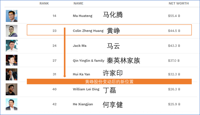 股份降低到29.4%以后,黄峥的财富就降低到300亿美元左右,按今天福布斯的实时排名,他就要降到许家印的后面,成为第5名,尽管还是很高,但至少失去了炒作的话题性。