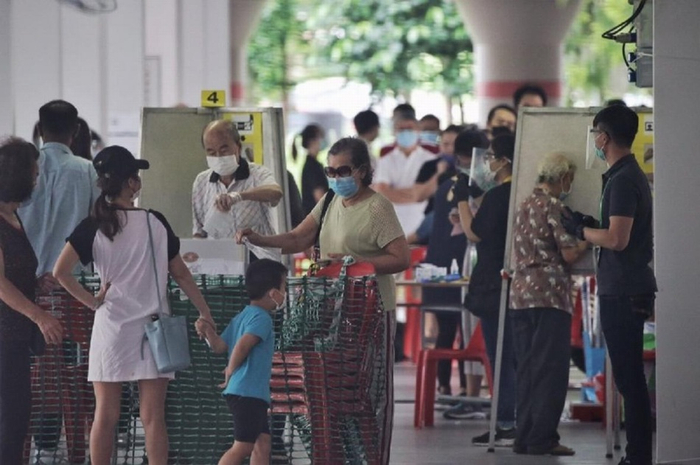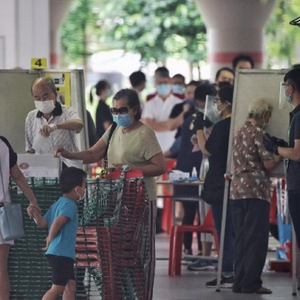 7月10日,人们在新加坡一处投票站戴着手套投票。