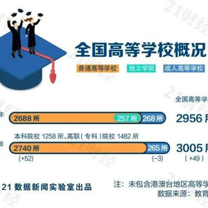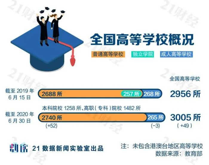 7月9日,教育部公布最新全国高等学校名单:共有3005所(较2019年同期增加49所),其中普通高等学校2740所。