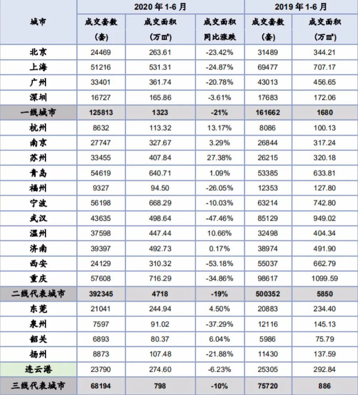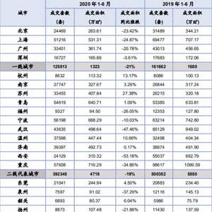 2020年1~6月全国主要城市成交情况数据来源:中指院
