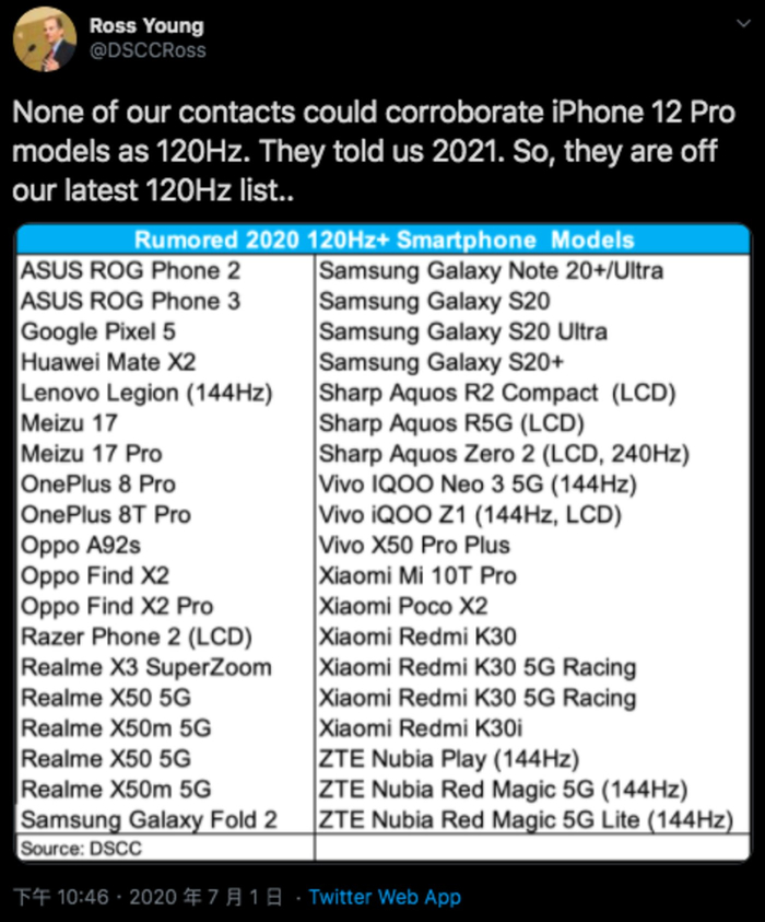 Display Supply Chain Consultants的创始人Ross Young在社交媒体上表示,他从供应链获知iPhone 12 Pro系列手机将不会使用120Hz高刷屏,而这一配置要到2021年的iPhone上才能见到。