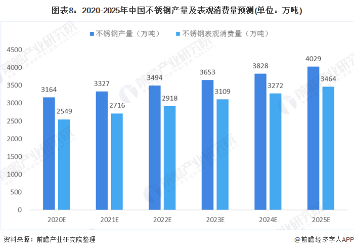 受疫情等因素影响,2020年宏观经济虽有较大的下行压力,但幅度可控。由于政府陆续加大对基础设施的投资力度,并采取降低融资成本等措施确保宏观经济稳定在可控水平,2020-2025年间中国不锈钢的产量或将延续前几年的高位状态,不锈钢的需求也将在保持高位不变的情况下略有小幅波动,到2025年中国不锈钢产量和表观消费量分别达到4029万吨和3464万吨。