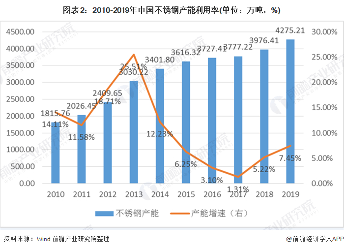 2019年不锈钢粗钢产能增长7.5%至4275万吨,未来1-2年仍有450万吨左右不锈钢产能等待投产。近年来我国不锈钢产能利用率多维持在70%以内,产能总体过剩。