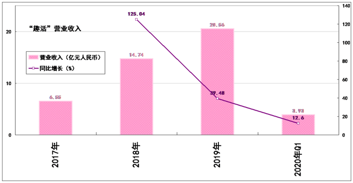 2018、2019年,趣活同比营收增速分别为125.04%、39.48%。2020年一季度营收为3.93亿元,较上年同期的3.487亿元增长12.6%。