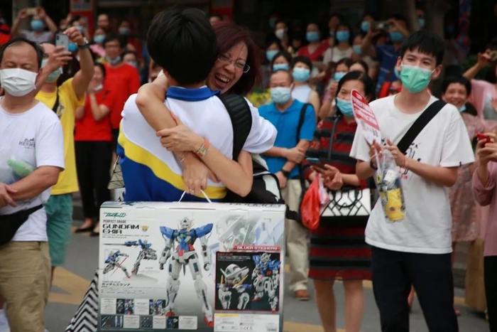 有妈妈穿着汤姆猫人偶服迎接考完的儿子