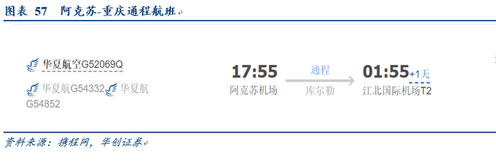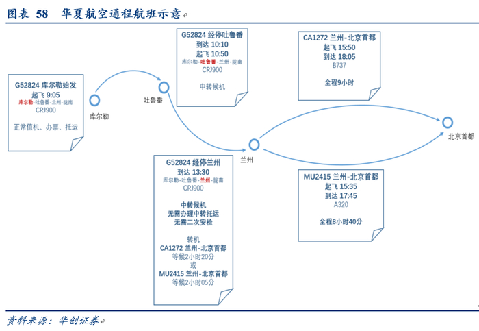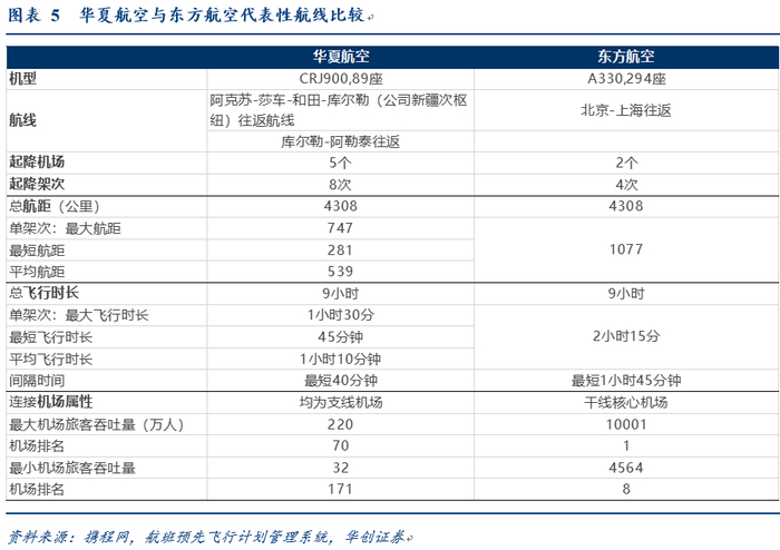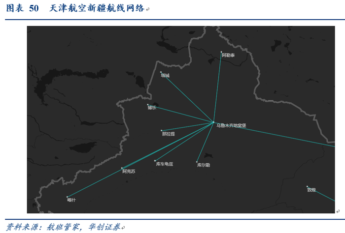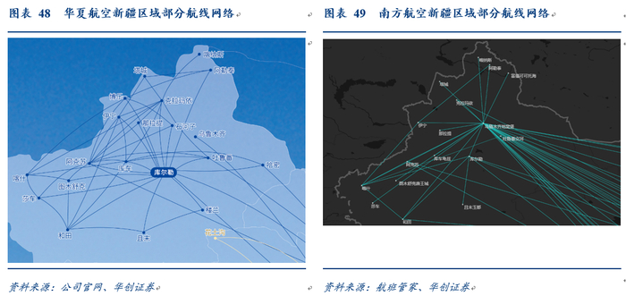 2)前述我们分析华夏与南航新疆航线布局:华夏以疆内串飞、环飞成网,南航以乌鲁木齐为中心点呈放射状。