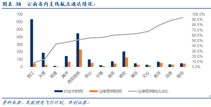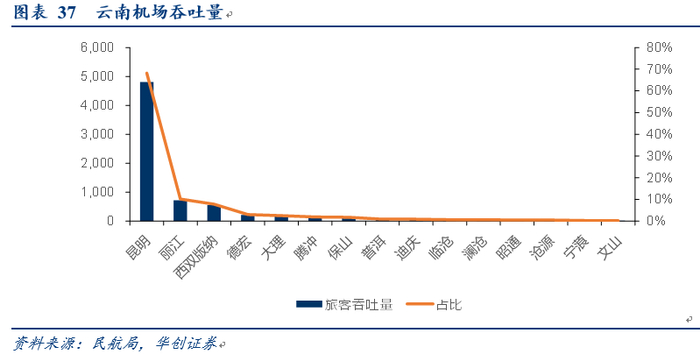 云南:公司云南航线占自身比重2.1%,明显低于全国的12%,而云南省内除了昆明、丽江、西双版纳外,其余12座机场旅客量占比不到20%,一定程度类似于新疆。