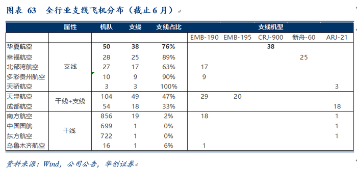 纯支线机型数量看:天津航空拥有49架为国内最多,华夏航空38架第二(华夏另有11架A320),幸福航空25架第三。