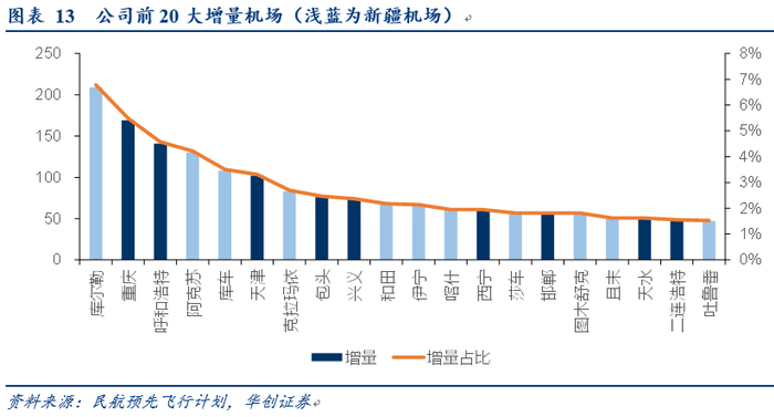 具体到城市时刻增量角度,公司15冬春航季至20夏秋航季时刻增量前20大城市/机场中,有12个城市为完全新进入市场,且除河北邯郸外,剩余11个机场全部位于新疆,包括增量第一大的库尔勒(增量占比6.8%)、第四阿克苏(4.2%)和第五库车(3.5%)。