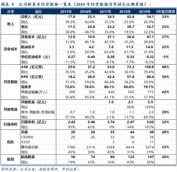 航线开拓看:公司15年航线56条,19年达到147条航线,近5年复合增速26%。