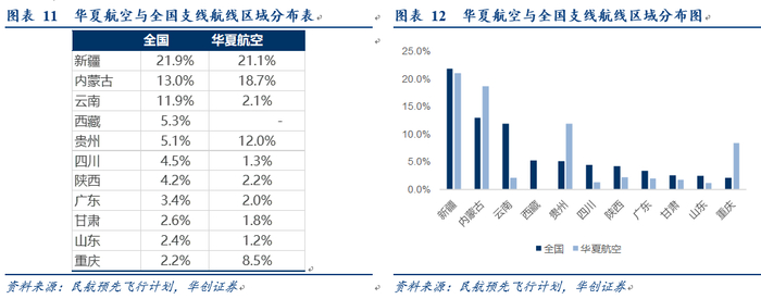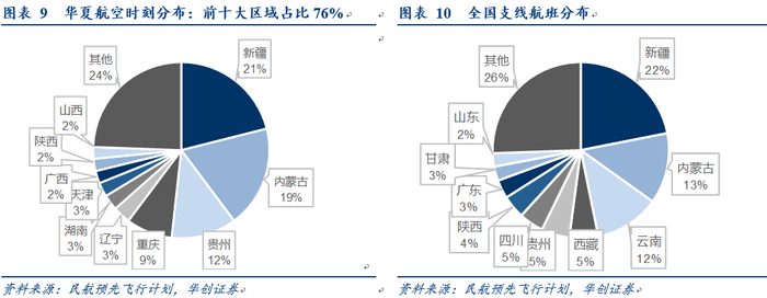 我们统计,全国维度看,新疆(22%)、内蒙古(13%)、云南(12%)、西藏(5.3%)、贵州(5.1%)为支线航空覆盖前五大区域,集中于西部地区。华夏航空从2015年开始不断进行航班调整后,总体分布已与国内整体分布较为契合。